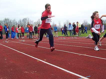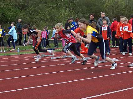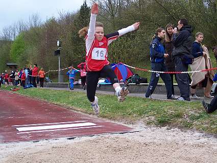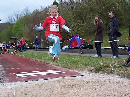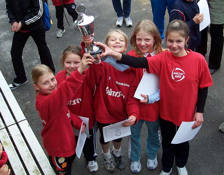 Vor allem die geschlossene Mannschaftsleistung sorgte letztlich für den Erfolg in dem 26er Teilnehmerfeld der C-Schülerinnen. Mit besonderen Einzelleistungen hoben sich aber erneut die beiden Mehrkämpferinnen Sabrina Höhmann und Franziska Kappe hervor. Sabrinas Stärke war erneut der Ballwurf mit 27 Metern, aber auch im 50 Meter Sprint, wo sie sich mit 8,92 Sekunden gegenüber der letzten Saison gut verbessern konnte. In der Addition erzielte sie 970 Punkte und führt damit die Mannschaftswertung an. Franziska zeigte mit 8,3 Sekunden über die 50 Meter, dass sie trotz ihrer geringen Größe über viel Talent im Sprintbereich verfügt. Im Weitsprung konnte sie mit 3,11 Meter aus den drei Versuchen ihr bisher bestes Ergebnis erzielen. Mit 933 Punkten belegte sie den Bronzeplatz der W 10. Die beiden Neuzugänge Laura Elsenbruch und Isabell Nette fügten sich problemlos, mit ebenfalls überraschend guten Leistungen, in das Team ein. Angelique Lehmann, als Jüngste erst kurz vor Wettkampfbeginn in die Mannschaft aufgerückt, durfte bei der Siegerehrung den Siegerpokal als erste stolz übernehmen. |