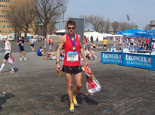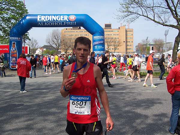 Eine Unterbietung seiner Vorjahreszeit aus Hamburg von 2:53 hätte sicherlich ausgereicht. Für Karsten spricht aber weiterhin seine bisher persönliche Bestzeit von 2:45, erzielt im Oktober 2007 in München. Mit Gesamtplatz 426 und Platz 83 in seiner Altersklasse M 35 hat er dennoch viele Tausend Läufer hinter sich lassen können. Selbst die beste Deutsche Läuferin (3:00:31) überholte Karsten noch vor der 600 Meter langen Zielgeraden. |