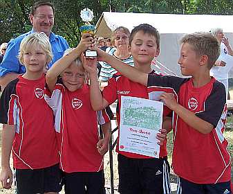 Einen weiteren Pokalerfolg feierte die 4 x 50 Meter Staffel der D-Schüler. Florian Hinkelmann, Timon Neumann, Julius Kappe und Noah Deisl setzten sich deutlich gegenüber den Konkurrenten durch. Verdient wurde ihnen der Pokal durch den Vorsitzenden des MTV Hornburg überreicht. | |||||||||||||||||||||||