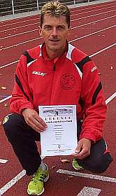 5000 Meter Distanz und wurde mit neuem Vereinsrekord Bezirksmeister der Senioren M 35. Mit diesem Titel konnte unser Sportliche Leiter erstmals eine große Meisterschaft im Bezirk Braunschweig auf der Bahn gewinnen. In dem 20-köpfigen großen Teilnehmerfeld, welches zu Beginn der 12 ½ Stadionrunden äußerst taktisch lief, versteckte sich Karsten zunächst hinter seinem stärksten Konkurrenten, Frank Polzen vom SV Union Salzgitter, der ihn im Frühjahr noch bei den Kreis-Crosslaufmeisterschaften in Salzgitter geschlagen hatte. Um die Zielzeit nicht unnötig in die Höhe schnellen zu lassen, zog er dann nach der ersten 1000 Meter Marke an ihm vorbei, um in der Spitzengruppe das schneller werdende Tempo mitzugehen. Dieser Vorstoß hat sich mit einer neuen Vereinsbestzeit von 18:01,13 Minuten gelohnt. Der bisherige Vereinsrekord lag bei 18:29 Minuten, ein Jahr zuvor an gleicher Stelle aufgestellt. Mit einem Vorsprung von 28 Sekunden auf den Zweitplatzierten gewann Karsten die Bezirksmeisterschaft der Senioren M 35 über die 5000 Meter. |