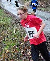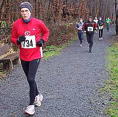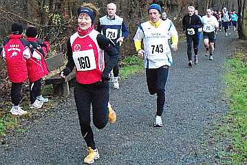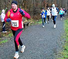 Zunächst gingen Sabine, Kai und Gerd am frühen Nikolausmorgen auf die 5,2 km Strecke. Als erste Frau und somit Siegerin auf dieser Distanz erreichte Sabine nach 23:54 Minuten das Ziel. |