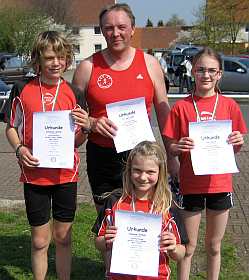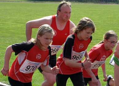 Bei der vom MTV Jahn Schladen ausgerichteten Bahnlaufveranstaltung liefen die vier angetretenen Langstreckenläufer des LAV 07 Bad Harzburg über die 3000 Meter Distanz ein sehr kompaktes Rennen und zeigten mit persönlichen Zeitverbesserungen von bis zu zwei Minuten gegenüber dem Vorjahr eine starke Leistung. Sowohl Angelique Lehmann (W11 13:19 Min.), Kai-Uwe Krüger (M45 12:58 Min.), Dominique Lehmann (M13 - 12:45 Min.) wie auch Lea Ahrens (W12 12:48 Min.) (von links) wechselten sich ständig über die siebeneinhalb Stadionrunden gegenseitig als Führungsläufer in ihrem Team ab.