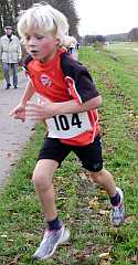 auf die sie in der Saison noch nicht gestoßen waren, zu tun. Daher war von ihrem Trainer Karsten Kappe „Vorsicht“ angesagt. Dennoch entschieden sich die Harlingeröder auf "Angriff" nach dem Startschuss. Diese Taktik hielt sie bis zur Mitte des Rennes gemeinsam an der Spitze. Julius musste als erstes einige Schritte von seinem Bruder abreißen lassen, bis schließlich noch zwei ältere M9er auch Johannes´ Führungsposition übernahmen. Hier merkte man deutlich, dass die Erkältung noch in seinen Beinen steckte, da er nicht zu seinem gewohnten Zielsprint ansetzen konnte. |